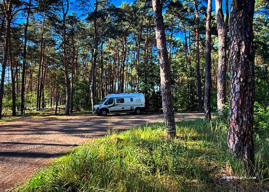 Parkeerplaats langs de weg omgeven door bomen. Als je helemaal naar achteren parkeert, hoor je het verkeer helemaal niet. Hier een nacht geparkeerd tijdens het laagseizoen en we waren het enige voertuig.