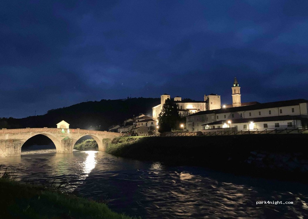 Man steht etwas exponiert, aber der Blick auf das Ensemble von Brücke, Castello und Kirche ist phantastisch. Obacht: Zufahrt direkt vor der Brücke. Sind erst vorbeigefahren.