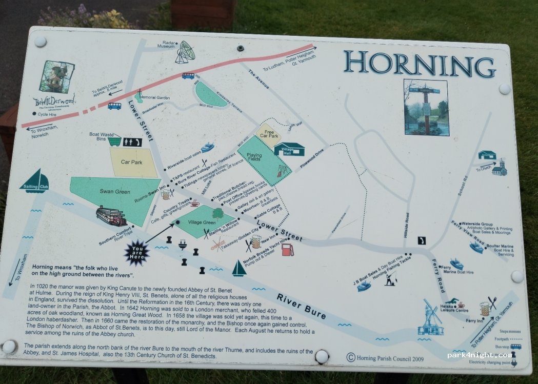 Horning village paid car park. Free overnight. Flat. By the public toilets, sailing club, river, Swan pub, restaurant, shop, post office all within 100 yards.