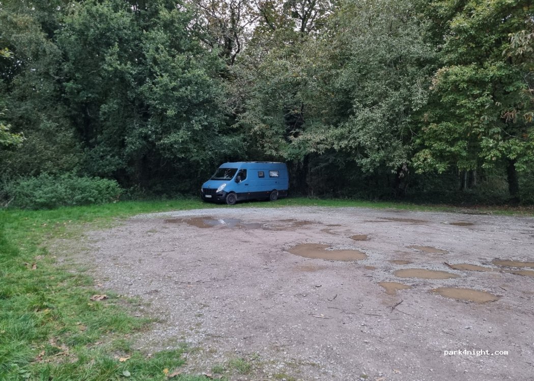 Lovely small car park with direct access to road and woods. Hard standing and level. Very private and quiet. Amazing spot. Dog walkers come in the morning but they don’t disturb