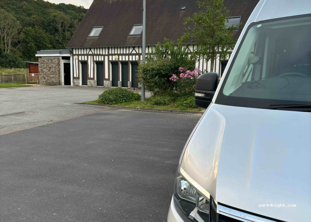 Nice and quiet overnight parking at the Town Hall. Toilets available 24h. Has a 2.6km walking trail along the water cress stream and a boulangerie in the village about a 5 minute walk.