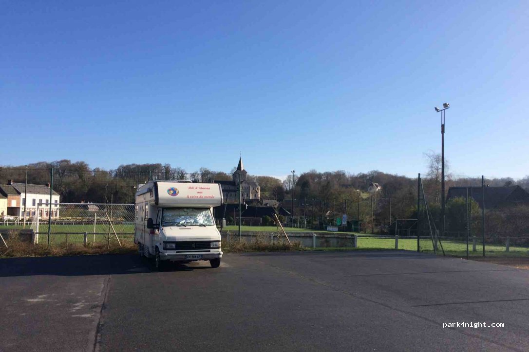 Parking de la salle communale, entre le terrain de foot et le terrain de tennis. En contre-bas de la route. Très calme et proche du centre ville. Il y a le long de la rue aussi beaucoup de place. Aucune interdiction.