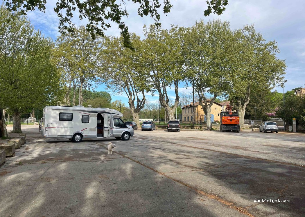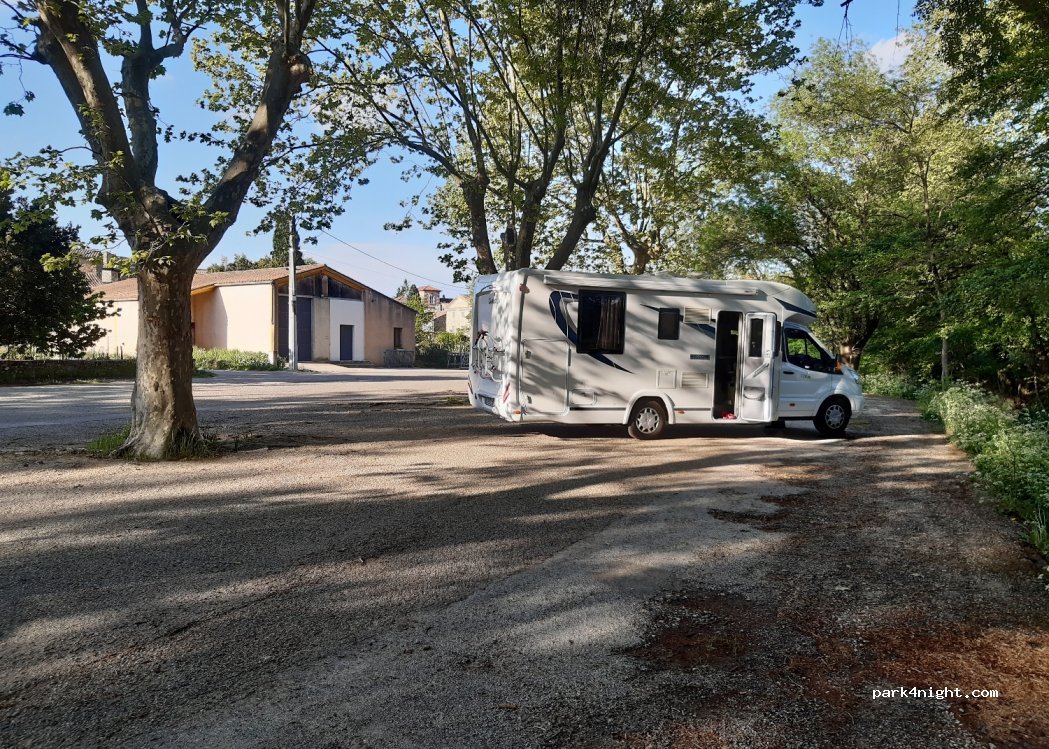 Endroit parfait pour journée et nuit. Très grande place ou l’on peut manœuvrer et stationner même avec un très grand CC. Ombre ou pas, il y a le choix. Nuit très calme. L’ensemble des voitures garées sont parties vers 22h. Ensuite personne ! Juste le bruit des cloches et de la petite rivière ! Génial ! Merci à la commune de Tresques qui est en plus un très beau village