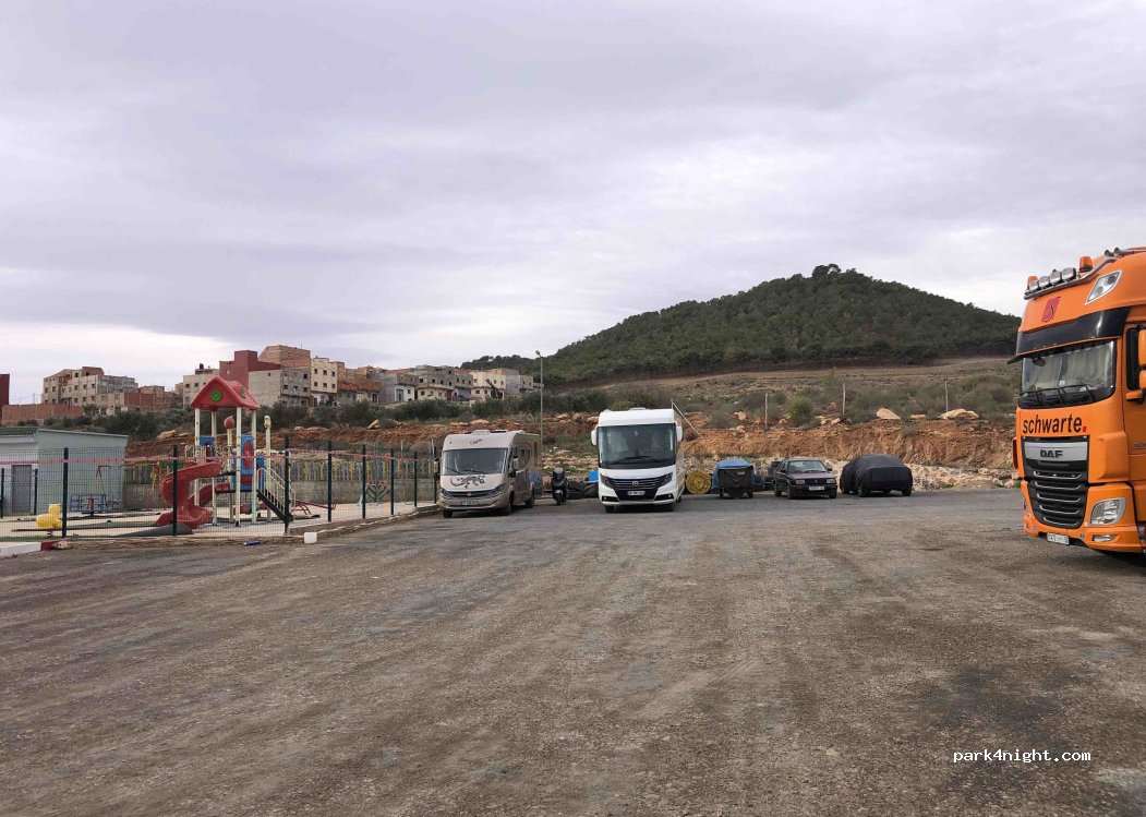 Nous sommes venus ici à ce relais routier / station-service. Il y avait des toilettes appartenant à une station-service, ainsi qu'un restaurant (fermé à cause du Ramadan) et une supérette. Il y avait un gardien de nuit qui nous a montré où se garer. C'était un peu en retrait de la route de mzin, donc pas de bruit de circulation aussi fort. Vous dirigez des camions et des voix mais cela ne nous a pas inquiétés. Nous nous sommes sentis en sécurité.