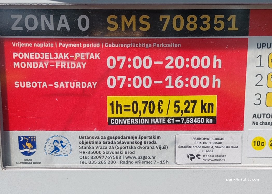 Parking on the street along the river Sava. Paid during the day (1h=5kn). Free between 19:30h and 8:30h. We stopped in this small city on Saturday evening to fill up our tank in one of the petrol stations and grab a quick dinner at a local restaurant (kručma Zen - delicious grill and very cheap, 2 min by foot from the street).