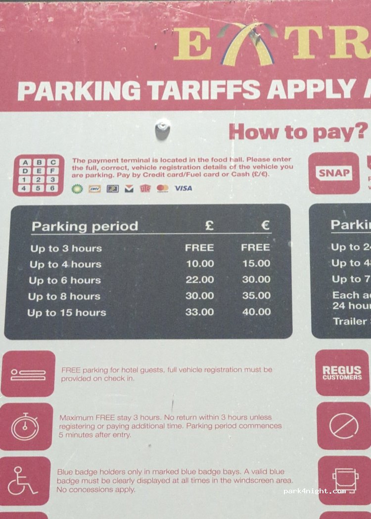 Große Raststätte mit vielen Shops und Tankstelle daneben. Parkgebühr ab mehr als 3 Stunden. Wir standen eine Nacht auf dem „additional parking“ Richtung Tankstelle und hoffen, dass dort kostenfrei war ;-) Die Beschilderung ist etwas unklar und versteckt. Die Nacht war (für eine Raststätte) einigermaßen ruhig, die Toiletten leider nicht wirklich sauber.