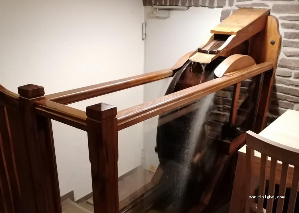 Les 4 emplacements se situent le long d'une petite route peu fréquentée. Borne pour recharge électrique et table de pic-nic à disposition. Nous avons rencontré des voyageurs sympas. De l'autre côté de la route se trouve l'auberge de la patronne sympatique aussi. Petit déjeuner copieux. Le soir on a bu une bière locale au coin d'un petit moulin à eau situé à l'intérieur de l'auberge (photo).