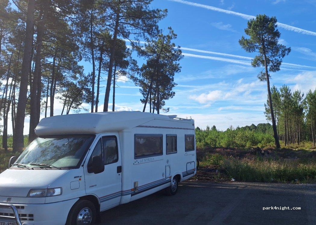 Un grand parking plat. Juste derrière la station essence. Et très à proximité de la route. La nuit pas de soucis mais on entend bien la circulation en journée. Cadre sympas avec des bois à côté. Dommage que ce soit si sale. Mais il n’y a pas de poubelles ni de toilettes publiques pour ceux qui n’ont pas de véhicule aménagé.