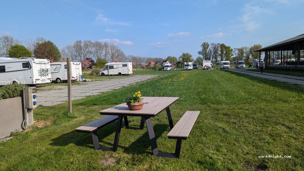 Zelfs in de winter een prima plek om te staan. Goed verhard. In geval van harde wind misschien beter om niet via de dijk aan te rijden maar binnendoor. Heerlijke omgeving om te fietsen. Vriendelijke eigenaresse heeft tips en folders over de omgeving