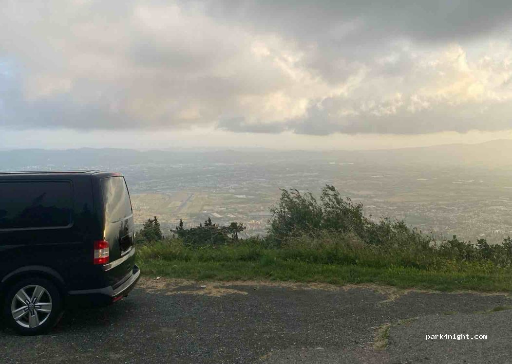 Parkmöglichkeit direkt am Straßenrand einer sehr wenig befahrenen Straße. Beste Aussicht auf die Stadt und den Flughafen. Gutes Restaurant und Bäcker sind gegenüber.