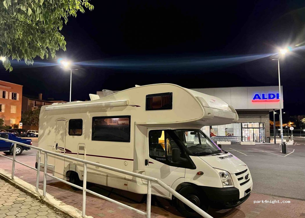 Parkplatz ALDI Supermarkt, Übernachtung erlaubt. Frische Bäckerei am Morgen, Supermarkt öffnet um 8 Uhr.