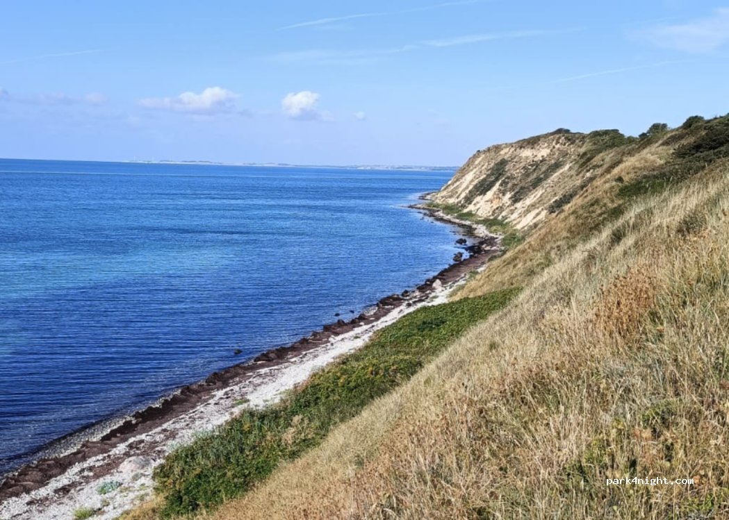 fijne plek vlakbij het startpunt van een schitterende wandeling over de klif naar een geopark. Het is hier rustig. Je loopt ook zo naar het strand. Heel geschikt voor kinderen.Je kunt heel ver lopen voor het diep wordt. Bij de haven bij Bagenkop kan je toilet en grijs water lozen. Vers water vullen. is een prullenbak en kan je douchen.(alles gratis)