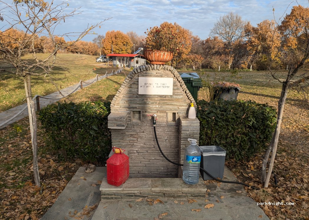 Ongelofelijk park 500 meter buiten het dorp Karpero, 's nachts heel rustig en met een prachtig uitzicht! Speeltuin voor kinderen, 2 kranen (het water is drinkbaar), openbare toiletten, veel schaduwrijke bomen en een barbecueplaats! Er is ook een wandelpad dat naar de rivier/het meer Aliakmonas leidt. Het dorp heeft een supermarkt, bakker, traditionele tavernes met Grieks eten, cafés, tankstation, kapper, etc. De lokale bevolking is ontzettend vriendelijk! De plaats is een paradijs voor natuurliefhebbers. Wij hebben er helemaal van genoten! (De box voor vrijwillige donaties staat naast de toiletten).