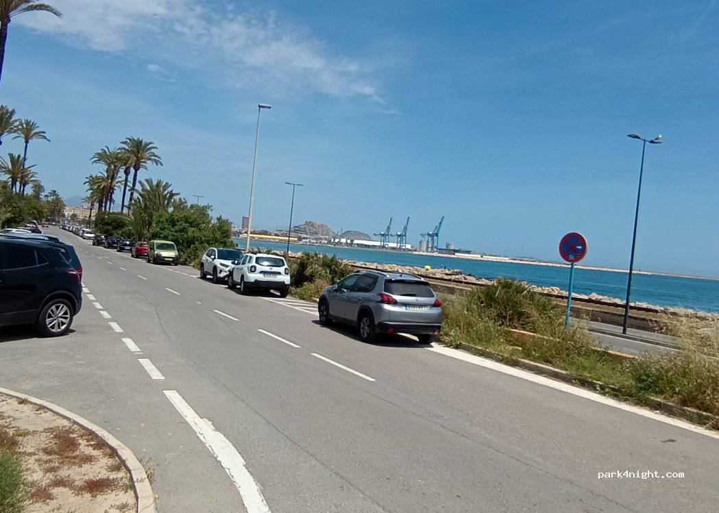 Free parking near the sea and the park "El Palmeral De Alicante". We stay during the day for visit the park; probably you can stay also during the night but it is close to the railroad and a busy road.