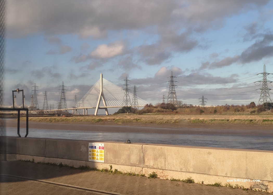 Arrived to a lovely winter sunshine view across the estuary. lots of parking available including disabled bays. plenty of waste bins for disposal of your rubbish. fishermen dotted along the estuary wall and lots of dog walkers about. Although this is a road on an industrial estate it seems pretty quiet with the odd car passing. Great find thanks to Park4night.