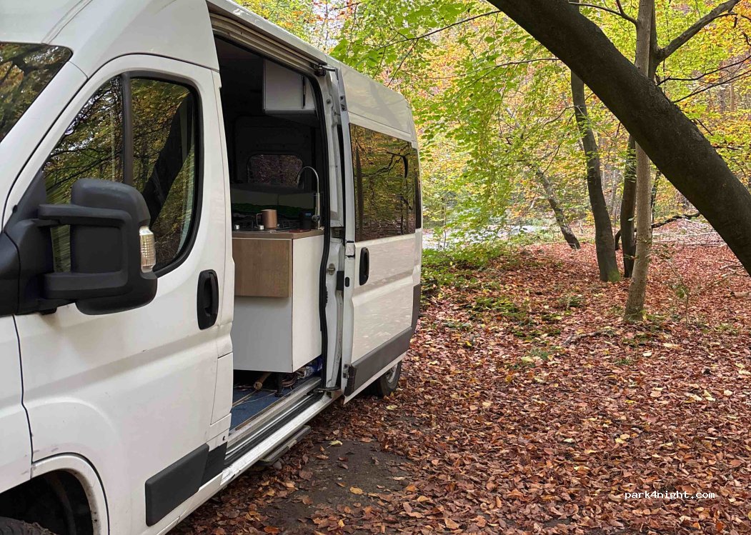 Great spot to park overnight. Arrived in the dark but the morning sun through the woods was amazing. Very quiet spot with a few other vans in the woods but not close.