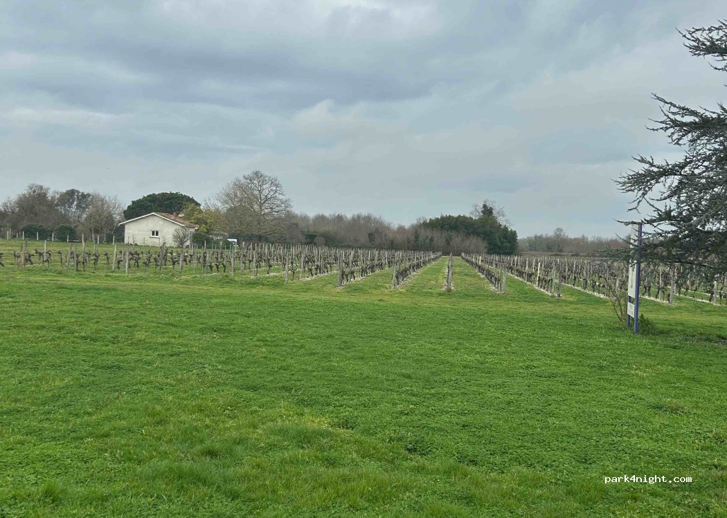 Absolutely fantastic experience. A warm welcome by Philipe (3rd generation wine producer) who makes you feel comfortable right away. Wine tasting not to miss, truly very good Medoc wines, of which one natural produced wine without sulfite, accompanied by local cheese, cold cuts and a passionate explanation. You park on the grass with some trees in front of the vineyards. Nice to walk around, see the bees, and early morning or evening some beautiful deer and when lucky some fox. Whilst waking up some hen curiously roamed around our rig. Totally silent and dark at night with a breathtaking blanket of stars above you with even the milky way clearly visible. In the morning Fabienne delivered us some delicious tomatoes, cucumbers and courgette from their own garden. Vincent, their son (4th generation) has bright ideas on improving tourism to their chateau, with facilities, pick-nic and even a dinner experience in the vineyards. This part is heavily neglected by tourist who all focus on the overcrowded coast whilst it is only a 20 min drive to the beach. It takes 5 min to the sea arm with a monumental lighthouse and typical fisherman huts. (Water, electricity and toilet are availible)