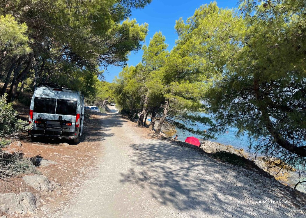 Perfect place! Many spots along the road to choose from. 3-4 other campers were there in high season, but there's enough place for everyone. The see is beautiful, and the view is amazing. In 25-30 minutes you can walk back to the town (Slatine) we had a very nice dinner, beers etc, and went back to the sleeping spot, which is very natural and calm. So it's the best of both worlds! :)