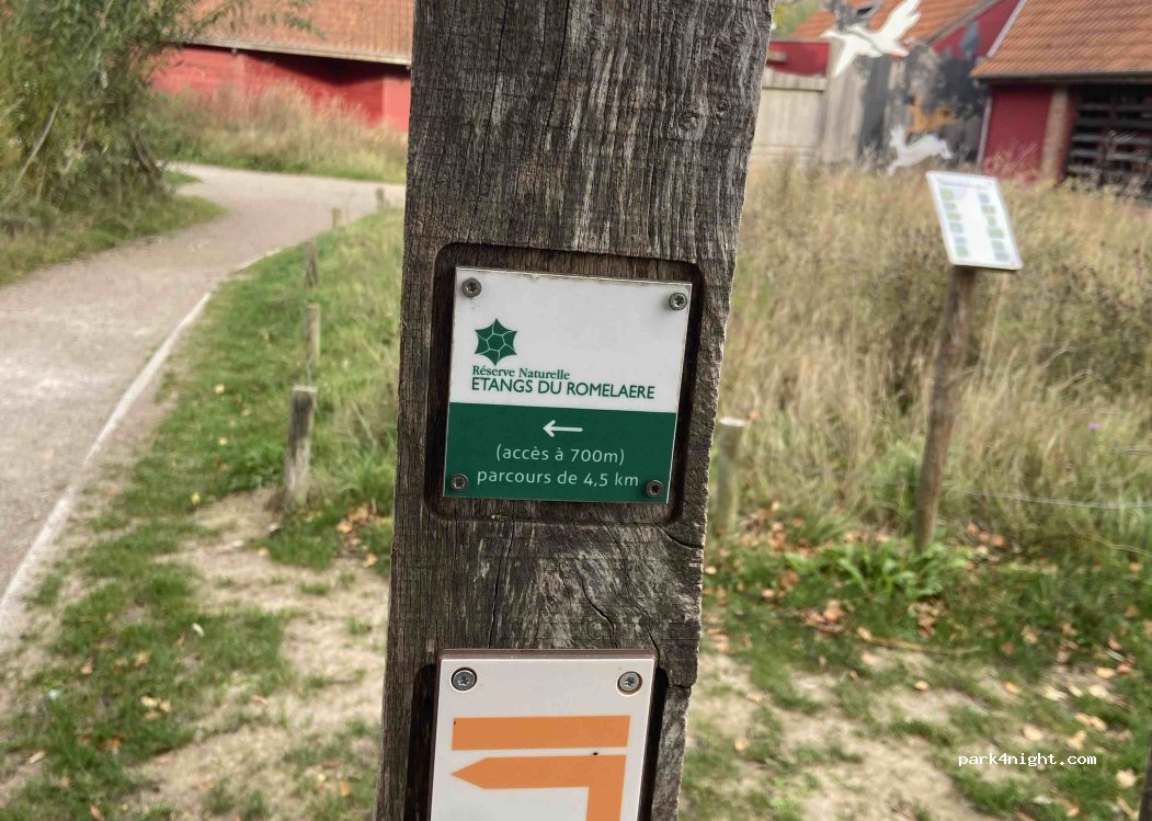 stationnement jour/nuit gratuit. Point de départ de la grange de la nature. Seul bémol comme souvent les voitures se garent côté CC au lieu de leur parking de l'entrée. Jardin pédagogique pour enfants ainsi que des randonnées pour tous dans les étangs du Romelaere. vous pouvez visiter la grange et découvrir l'expo sur la biodiversité . Possibilité d'effectuer des balades en canoë ou en bateaux.