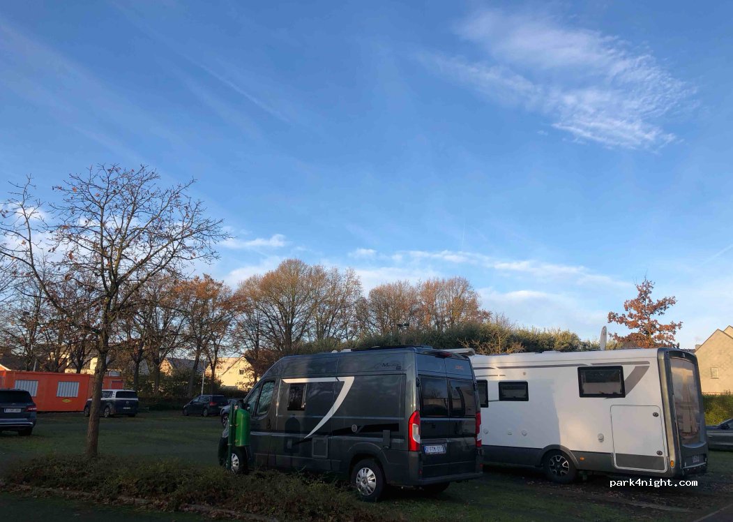Très grand parking avec beaucoup de verdure proche d'un lac. Piscine et autres centres sportifs, pistes cyclables. Nuit calme mais à éviter si l'on craint d'être réveillé par un des nombreux coqs habitant les lieux.