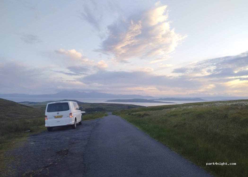 A peaceful night at this spot with beautiful views over to Arran in the morning. No bins so please take rubbish away with you. Sad to see a couple of other spots along this road were blighted by litter.