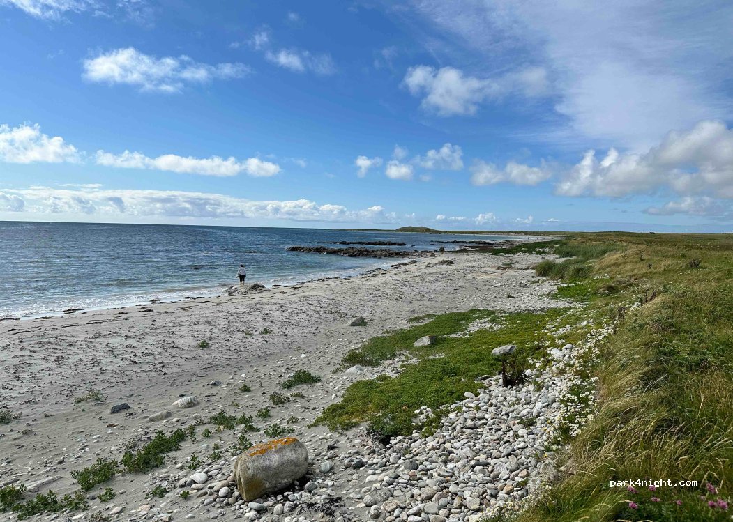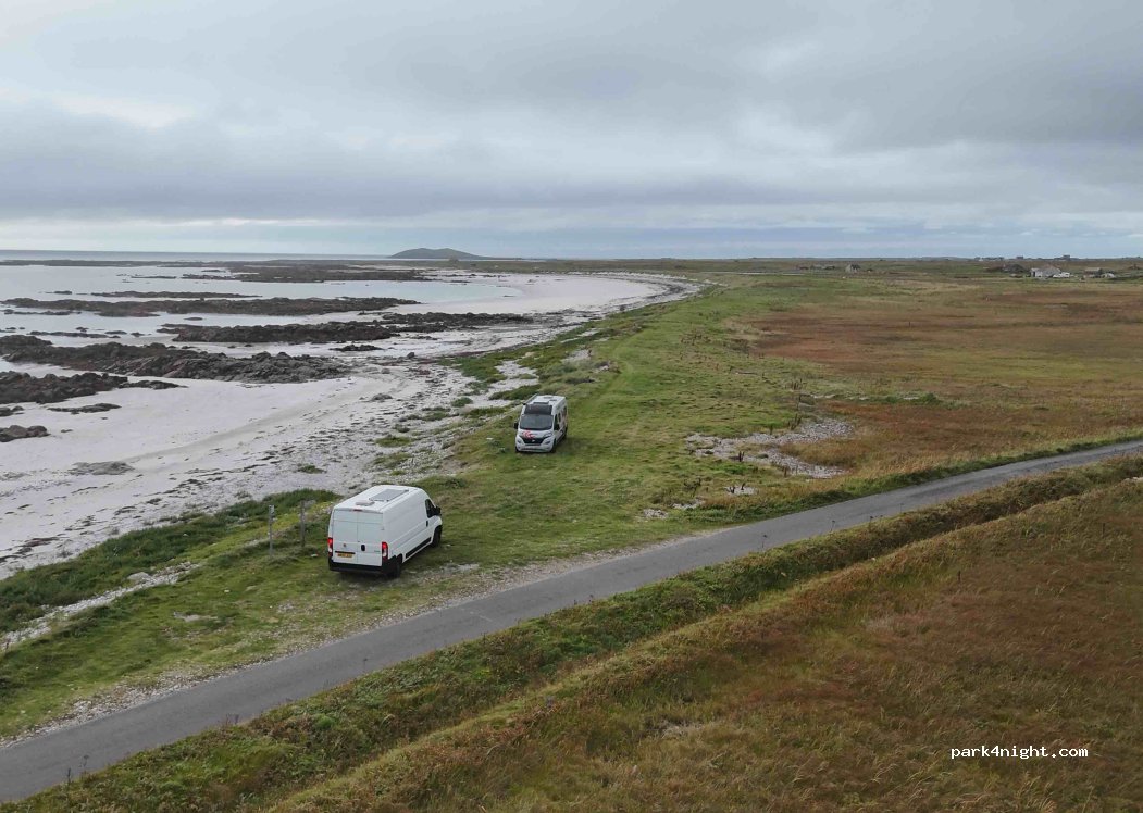 Lieu de nuit assez grand pour 2 camping-cars ou 1 camping-car juste à côté des panneaux du dernier virage avant le Polachar Inn. Juste à côté de la plage, magnifique coucher de soleil. Bon signal téléphonique 4g sur Three. Aucun service.