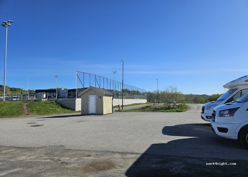 Parking, parties goudronnées autres parties gravillonnées. Ok pour passer la nuit et belle promenade autour de la baie (Mørkvedbukta). Il y a un terrain de football à côté et beaucoup de voitures sont apparues avec des enfants s'entraînant au football entre 18 et 21 heures, mais après cela, c'était très calme et il n'y avait pas de circulation.