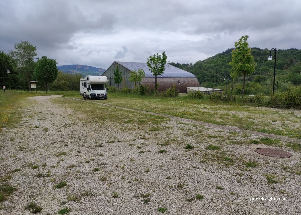 3 ampi parcheggi di fronte bocciodromo comunale. Acqua con rubinetto senza filettatura. Scarico grigie nere in tombino acciaio autopulente di 1 metro per 1 metro. Estremamente tranquillo e pianeggiante.
