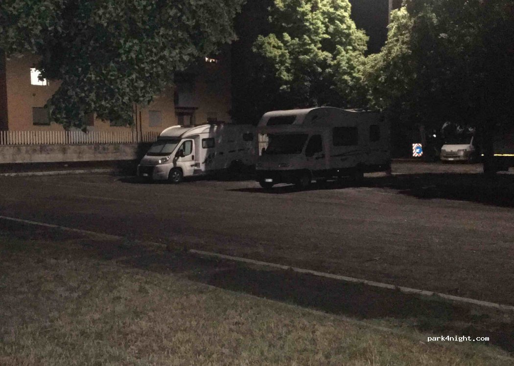 In front of the carabinieri station. Free parking area, in which there are several campers. Calm. No service.