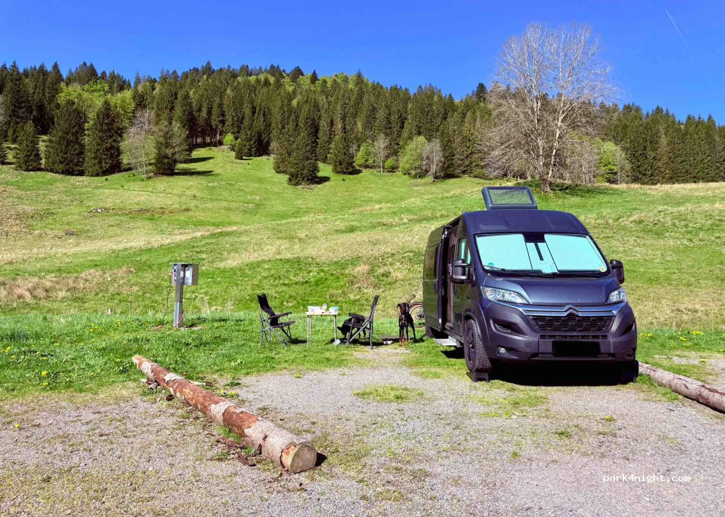 Bel emplacement très calme avec vrais paysages de la Schwartzwald. Eau et vidange gratuite à 100m du stationnement après le pont. Électricité 8h pour 1€. Stationnement 9€ pour 24h à payer dans une enveloppe à déposer dans la boite du cabanon remontée mecanique et double de la fiche sur le pare-brise