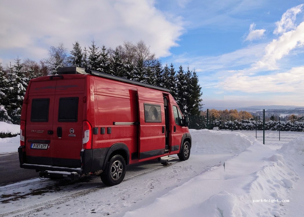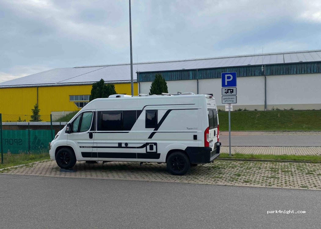 Stationnement à l'Aqua Marien. Signalisé spécialement pour les mobil-homes. Kaufland à 500m, restaurant et bar à 30m. Très calme ici.
