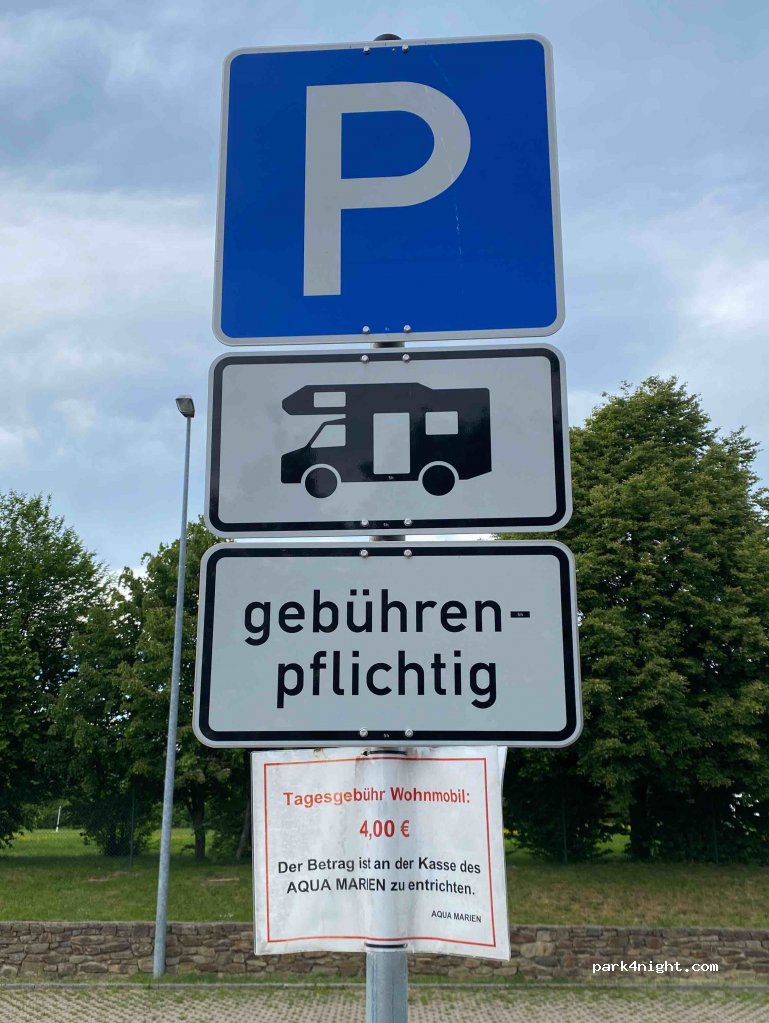 Parking at Aqua Marien. Signposted especially for mobile homes. Kaufland 500m, restaurant and bar 30m away. Very quiet here.