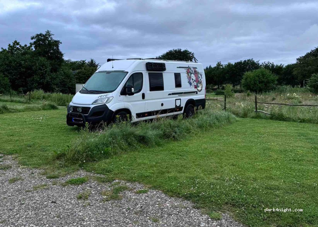 Bellissima arra sosta privata con diversi posti camper. Silenzio più totale e tutti i servizi essenziali, bidoni della spazzatura, carico acqua, scarico ed elettricità. Tutto compreso a 17€ o 125dkk da pagare ai gestori che ogni tanto passano di lì oppure come nel nostro caso da mettere nella cassettina. Super consigliato.