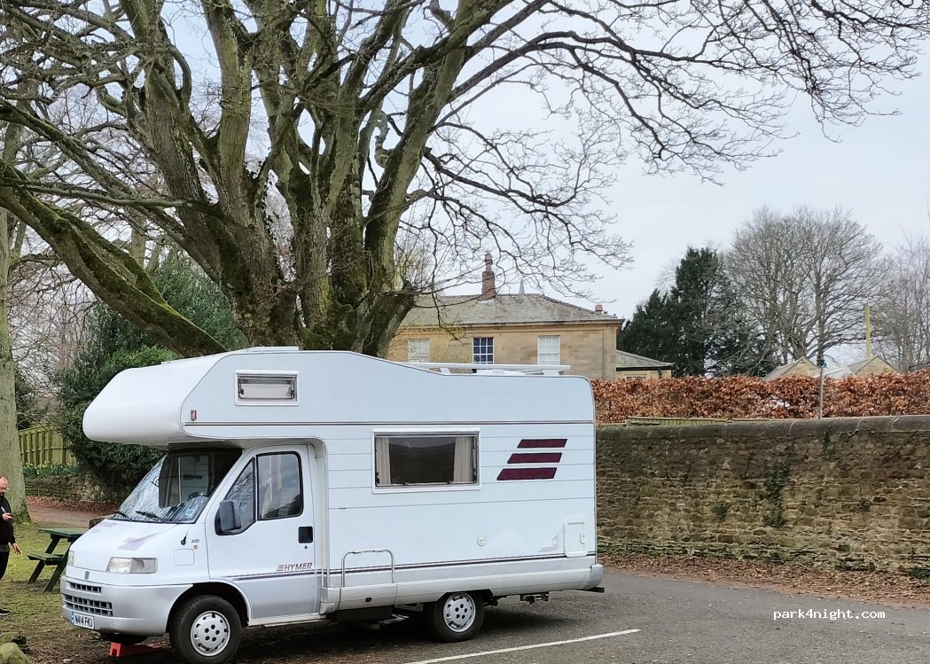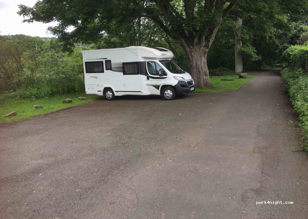 Rustige picknickplaats heel dicht bij het dorp, een paar hondenuitlaters in de ochtend. Winkels en pubs 200m. Een paar lage takken op de oprit, maar onze camper van 3 meter maakte het prima.