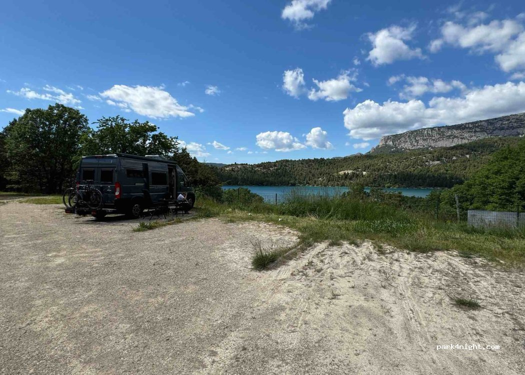 Area di sosta con bellissima vista sul lago di La Croix. L'area è ora gestita dal camping Les Galetas, quindi per l'accesso (che sta prima del campeggio sulla destra) è necessario recarsi presso la reception. Prezzo 10 €, con possibilità di usare i servizi igienici del campeggio a condizione di fermarsi per una sola notte fino alle 11 del giorno successivo. Ottima soluzione per visita gole Verdon