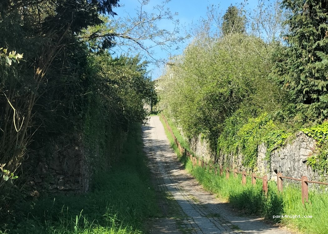 Bonito y tranquilo aparcamiento justo debajo de la capilla de Santa Bárbara. El camino de entrada es un poco empinado pero la vista es bonita (a pesar de la industria). En pendiente en toda la zona.