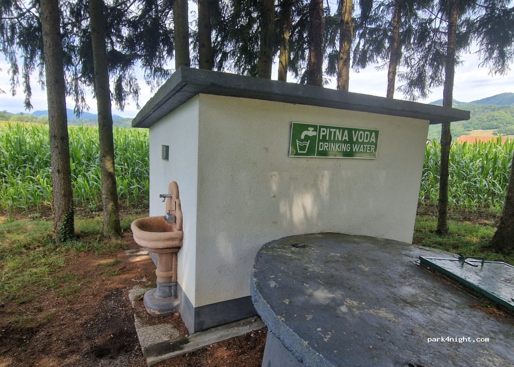 Petite aire de repos à une fontaine avec 3 bancs, robinet d'eau potable et une petite poubelle. Juste au bord de la rivière dans une petite rue latérale. Vous pouvez vous tenir au bord de la route et avoir une vue sur les champs environnants, les montagnes et la rivière qui coule doucement devant vous. La place est ombragée car il y a de grands conifères tout autour de la place.