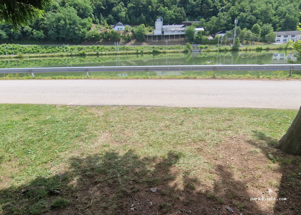 Kleine rustplaats bij een fontein met 3 banken, drinkwaterkraan en een kleine prullenbak. Direct aan de rivier in een kleine zijstraat. U kunt aan de kant van de weg staan en uitzicht hebben op de omliggende velden, de bergen en de rivier die zachtjes langs u stroomt. Het plein is schaduwrijk omdat er rondom het plein hoge naaldbomen staan.