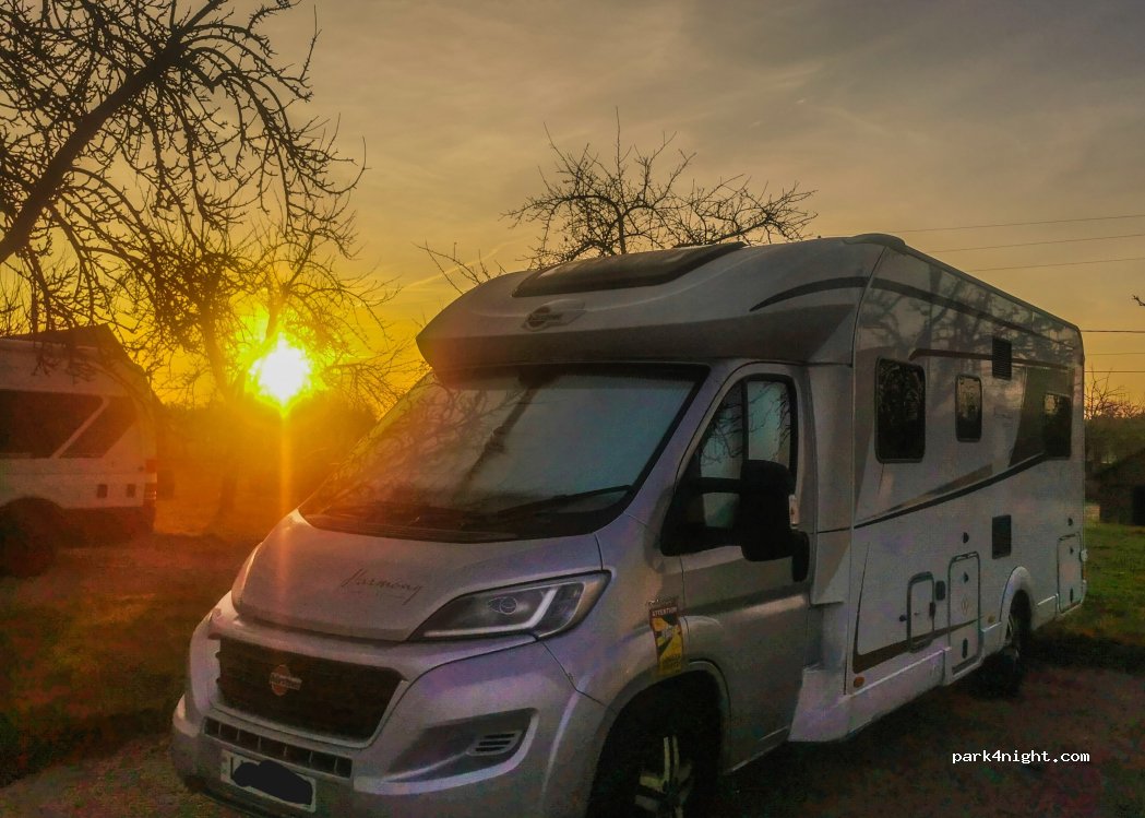Arrêt non programmé. Nous nous y sommes arrêtés car la fatigue nous guettait. Très bien signalé de la route nationale. Au calme, accueil chaleureux, au milieu des pommiers, âne et autres oies. Nuit très paisible, pas un bruit. service de vidange et remplissage inclus dans les 5 euros. C'était parfait, encore merci pour ce que vous faites.