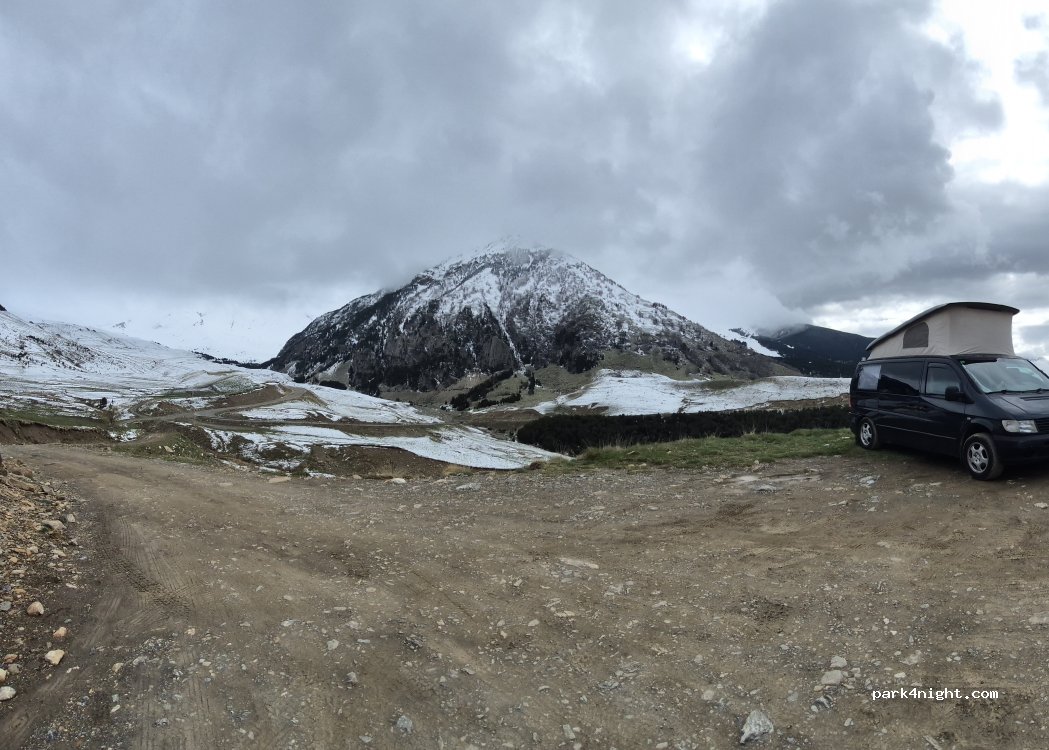 Espectacular zona donde pasar la noche. Con el Pico Cerler y la Sierra de Chía detrás. En este enclave solo cave una AC. El parking de antes és más grande.