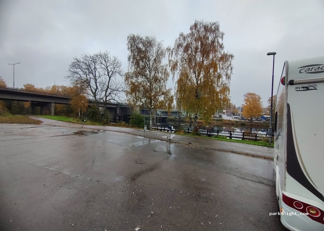 Pleasant parking by the river, some road noise from E45 close by. SKR100 low season 1/5 to 29/6 then SKR150 high season. No facilities except electricity. Payment by Swish or at harbour office - long walk or TI - limited hours. See signs.