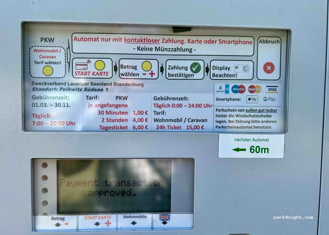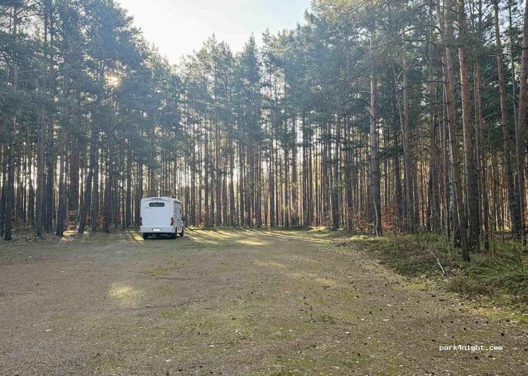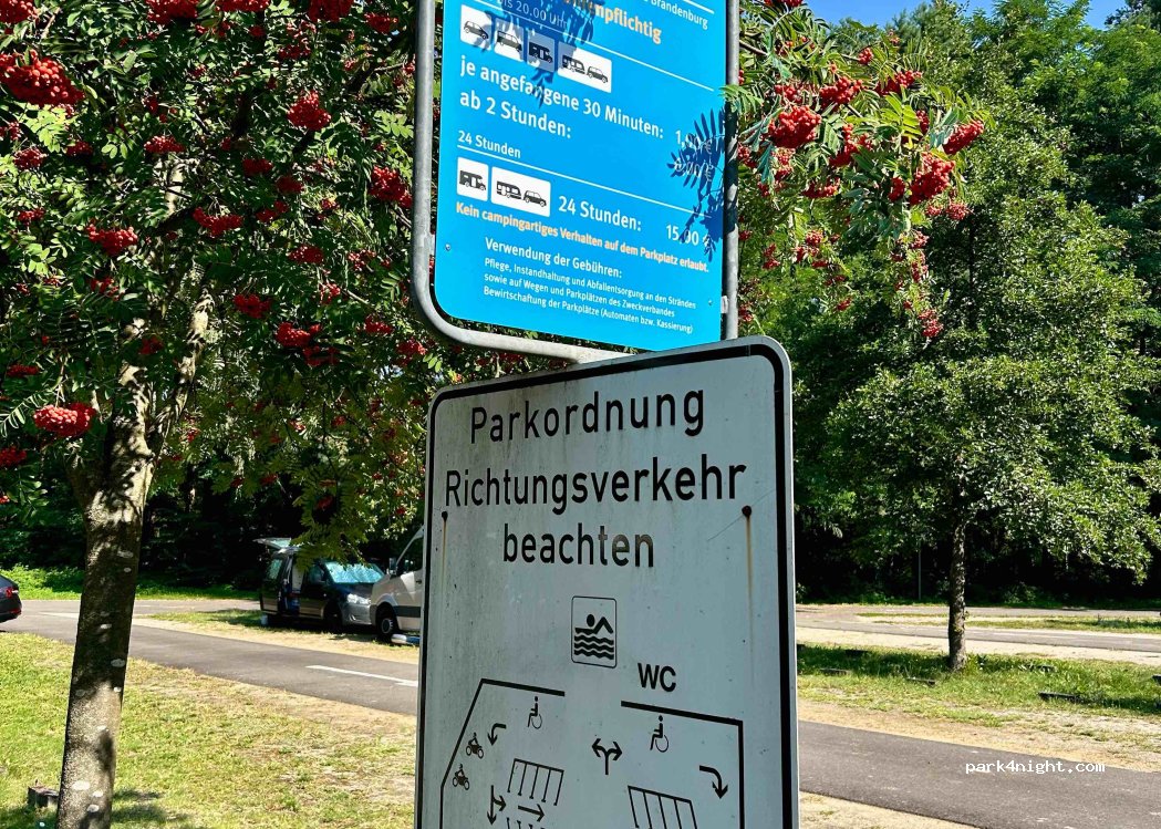 Ruhiger sauberer Parkplatz mit Übernachtungstarif am Parkautomaten. 10 Minuten Fußweg zum See/Imbiss/Strand.