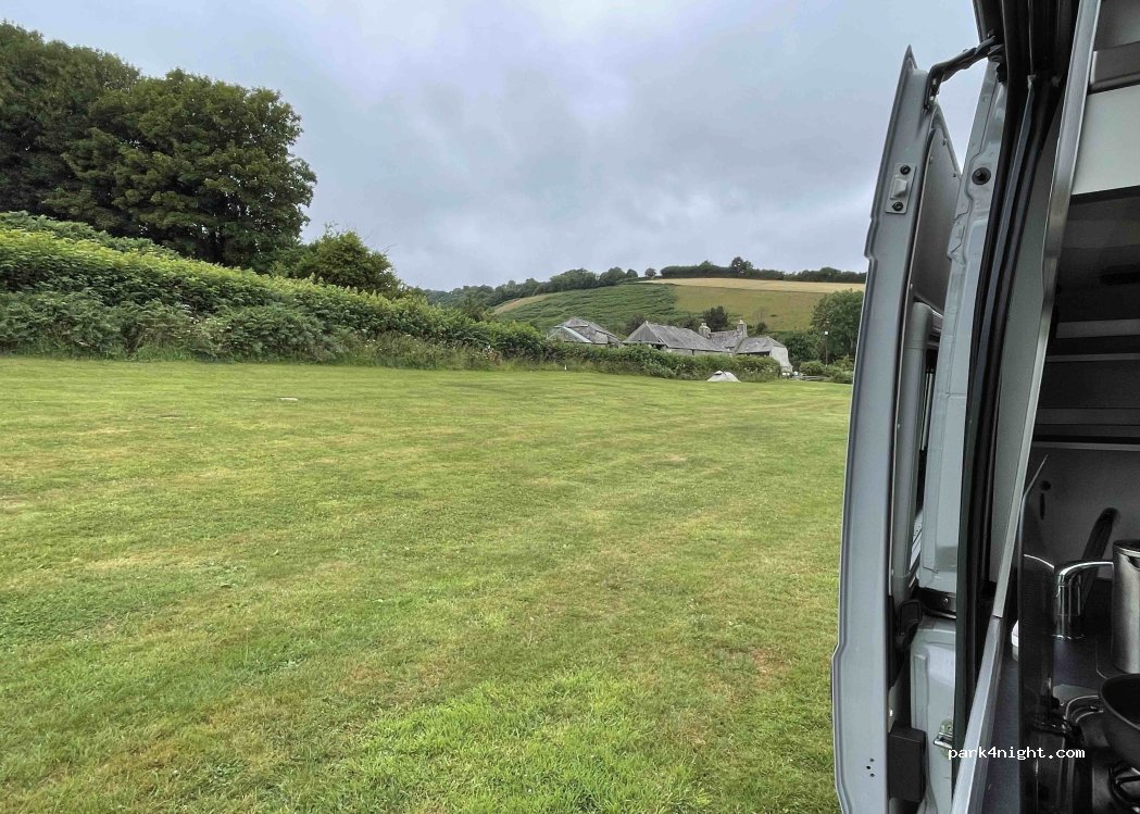 Quite a narrow lane to get there - worth it. Primitive facilities, but fine for a farmer’s field. Had a swim in the Dart. Friendly farmer who chugs up in the morning in his tractor for the tenner.