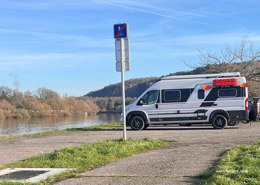 Am Straßenrand gegenüber von Kirschbäumen mit Blick auf die Meuse. Ein wunderbarer und ruhiger Ort. Da man sich in einem Wohngebiet aufhält, möge man sich bitte diskret verhalten. Stellen Sie sich besser nicht direkt vor die Häuser. Beliebt auch bei Hundebesitzern der Gegend. Am gegenüberliegenden Ufer gibt es eine Bahnlinie mit mäßigem Güterverkehr. Reger Schiffsverkehr.