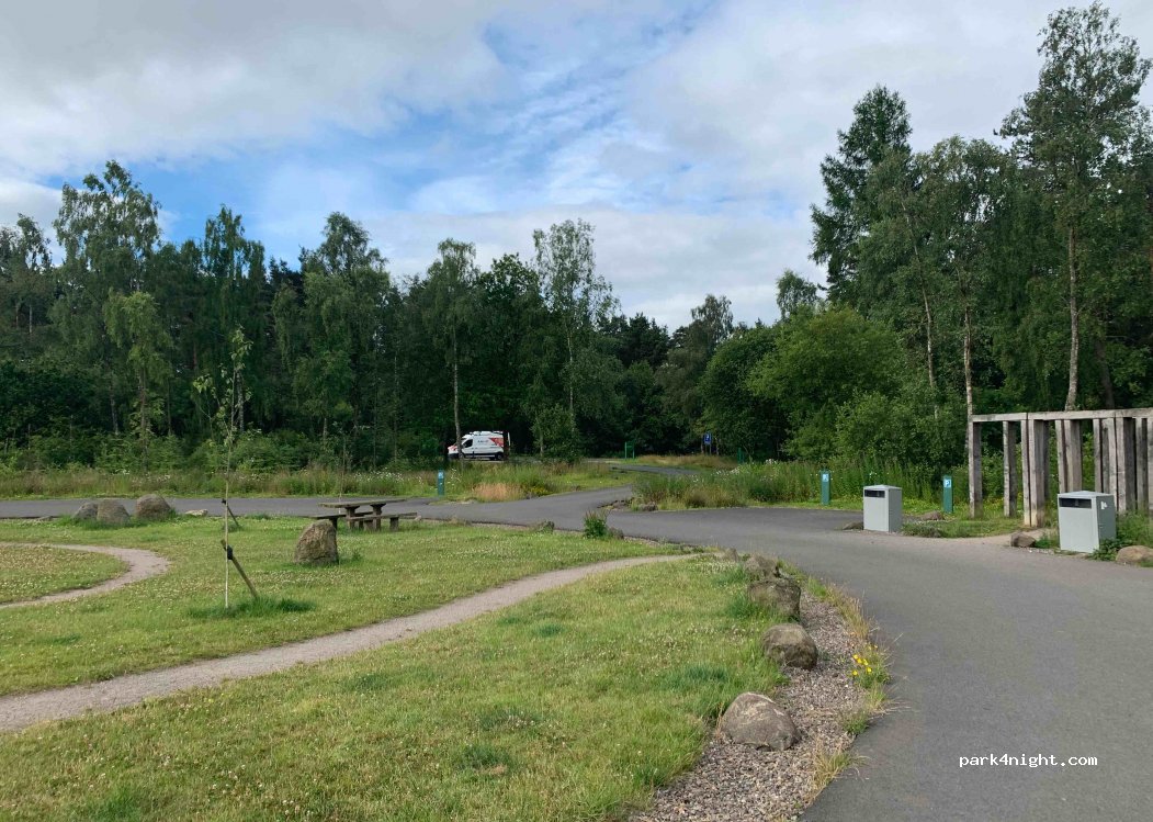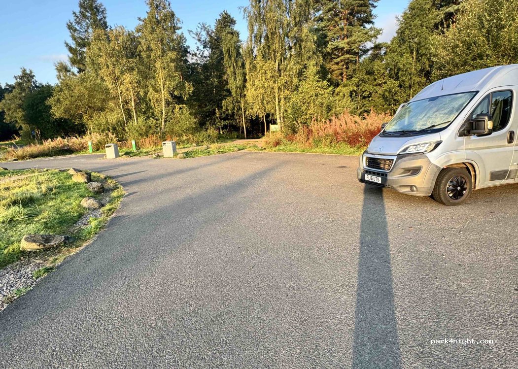 Great spot for onward visit to Edinburgh or Stirling. Forest walks. Road noise quiet over night. Solo in the car park, but felt very safe. Signal on and off 4G on O2. No services, so please respect the area. Full services available In Edinburgh at the Portobello site.