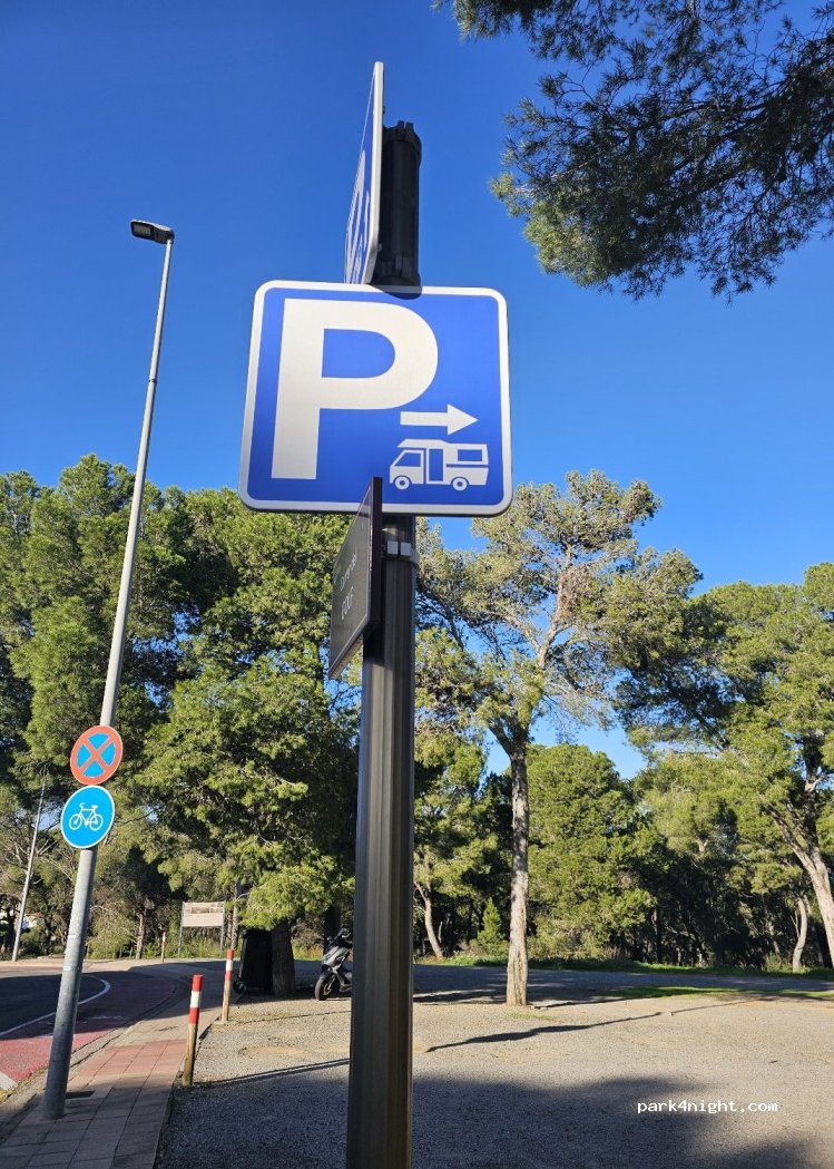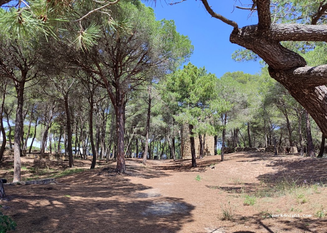 Clean pic-nic area in a pine forest, tables and toilets are available. By the toilets (in Llevant Road) there are few asphalt roadside parking spaces but we parked on the unpaved slope free camper parking located next to the roundabout between Carrer Del Golf and Carrer De La Torre Mora. From the parking, the beach is about 5 minutes away by foot.