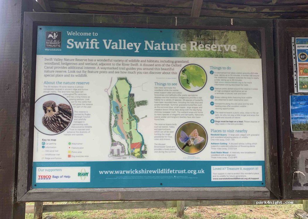 Nature reserve with car park. 2.1m height restrictions. Swift valley nature reserve with beautiful walks. Free car park. Check for overnight restrictions.