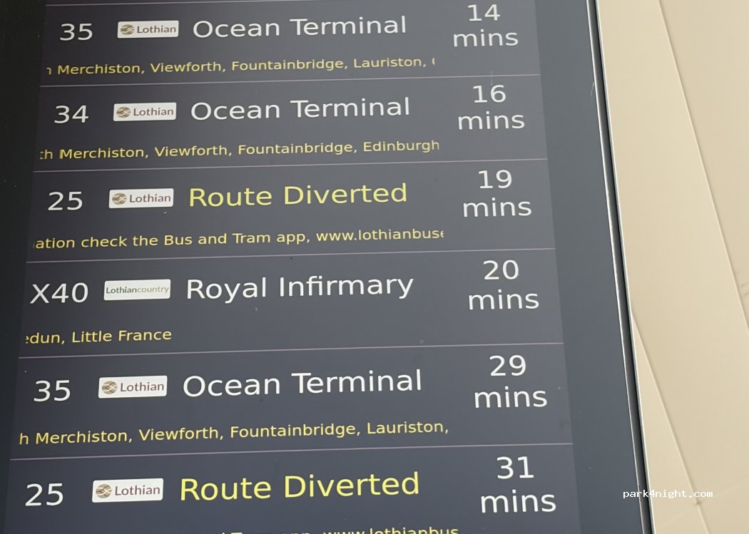 Parfait pour stationner gratuitement jusqu'à 3 nuits si vous êtes sur Édimbourg. Il n'y a pas de restriction de hauteur sur tout le parking, la barrière est ouverte ! Il y a plusieurs connexions avec des bus de jour et de nuit avec le centre ville.