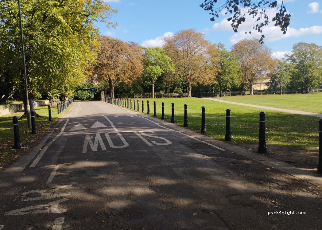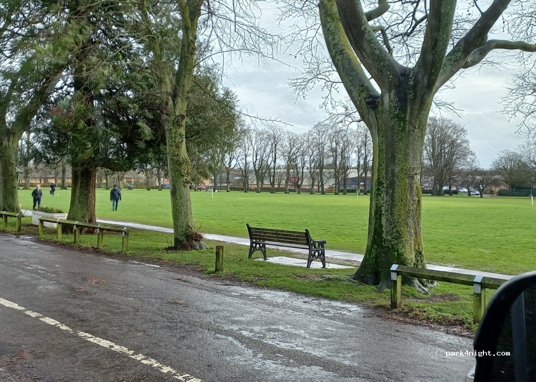 Free parking on large lawn, with public toilets, cafe, skate park, playground and Sainsbury's (supermarket)