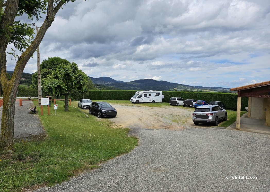Descendre 100m plus bas, devant les installations sportives. Nuit calme, pas de passage. Poubelles sur place. Emplacement large, en partie en herbe, plat et facilement accessible par un grand camping-car.